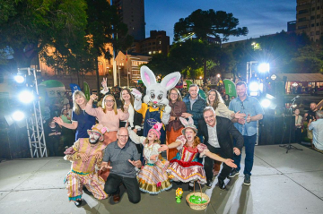 Foto: Ícaro de Campos/divulgação Na abertura da 3ª Páscoa em Caxias - O Doce Sabor dos Encontros, na noite de terça (10), na Praça Dante Alighieri, o público foi recepcionado por uma animada apresentação do Coro Municipal. As crianças eram a grande maioria do público. Usando orelhas e com o rosto maquiado como coelhinhos, esperavam a caráter e ansiosos o Coelho Deodoro. Ele chegou de trem com sua trupe, subiu ao palco e recebeu do prefeito Adiló Didomenico e do vice-prefeito Edson Néspolo a chave da cidade, oficializando a abertura da programação, que vai até 5 de abril.
